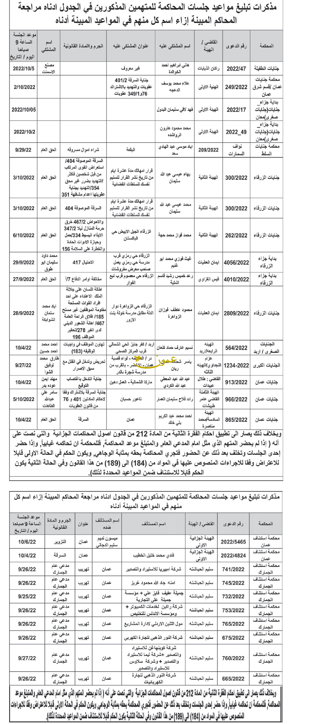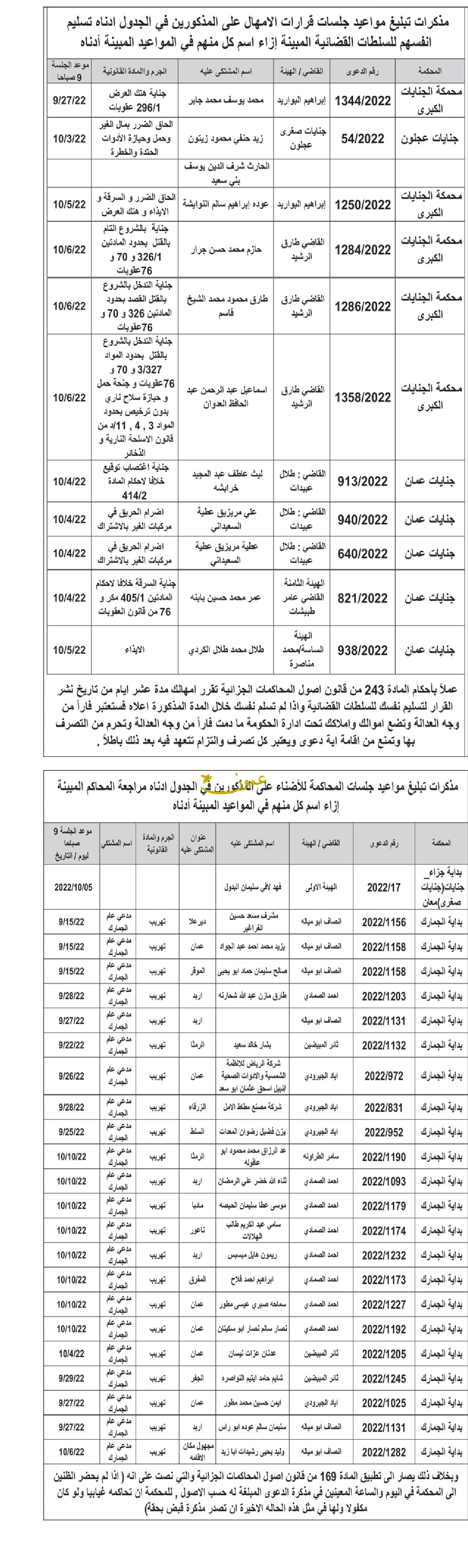 وفي مذكرات أخرى، طالبت محاكم متهمين مراجعة المحاكم المبينة إزاء اسم كل منهم في المواعيد المبينة.