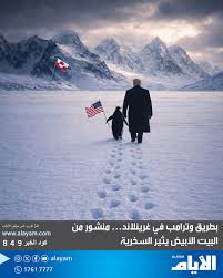 وتظهر الصورة ترامب وهو يسير على أرض جليدية برفقة بطريق مع خلفية من صور غرينلاند.